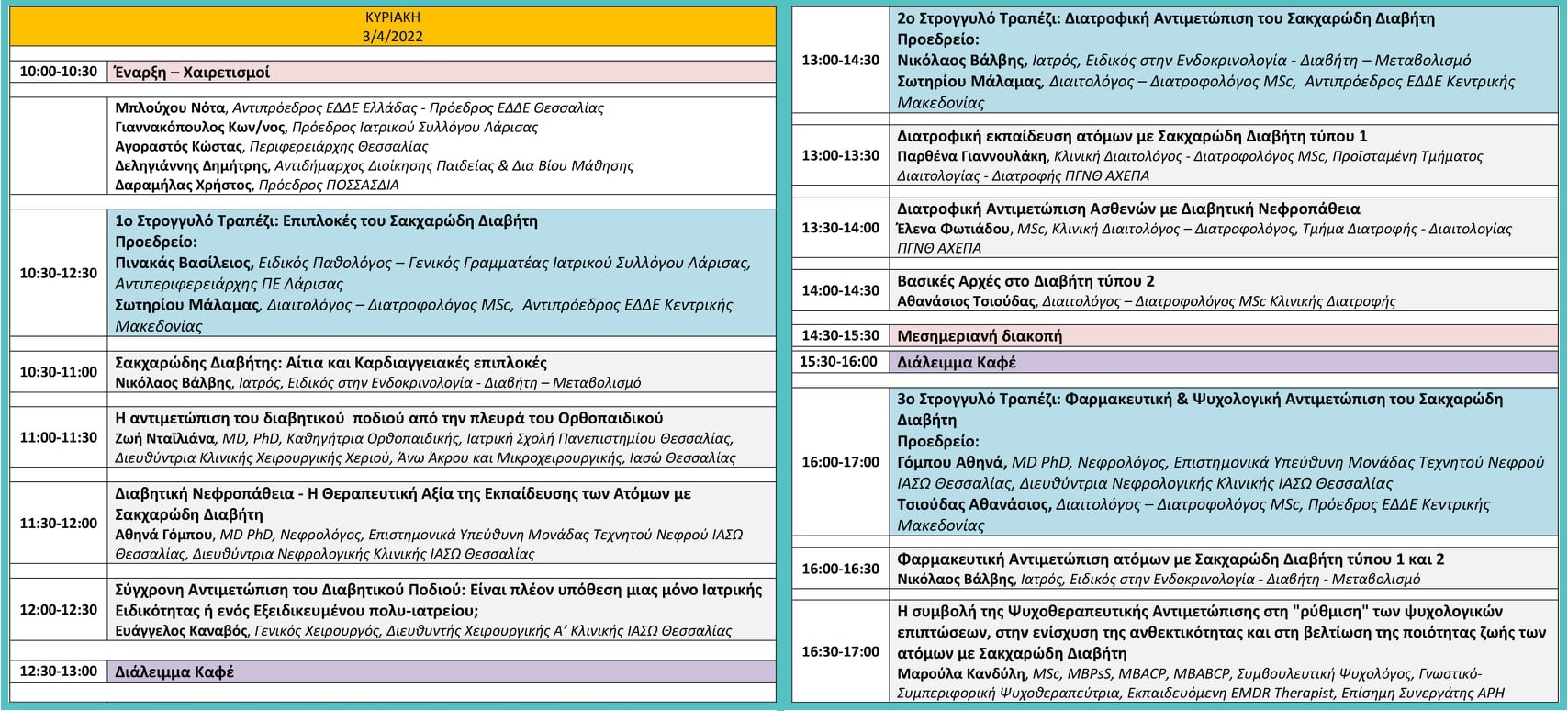 Η Ημερίδα διοργανώνεται από το Περιφερειακό Τμήμα Θεσσαλίας της Ένωσης Διαιτολόγων-Διατροφολόγων Ελλάδας, θα είναι υπό την Αιγίδα του Ιατρικού Συλλόγου Λάρισας και της Πονελλήνιας Ομοσπονδίας Σωματείων-Συλλόγων Ατόμων με Σακχαρώδη Διαβήτη (Π.Ο.Σ.Σ.Α.Σ.ΔΙΑ), και θα διεξαχθεί στις 3 Απριλίου 2022, στο Ξενοδοχείο "LARISSA IMPERIAL" της GRECOTEL, στην Λάρισα.